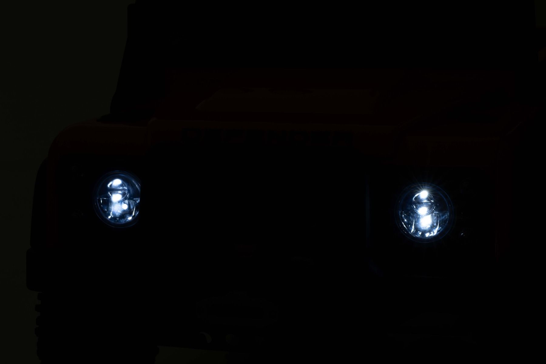 Elektrické autíčko Land Rover Defender 110 SVX 12V, oranžové, 4X4 pohon, LED svetlá, predné aj zadné odpruženie kolies, 2.4 GHz diaľkové ovládanie, USB/Aux Vstup, Bluetooth, Lítiová batéria, 4 X 25W motor, ORIGINÁL licencia