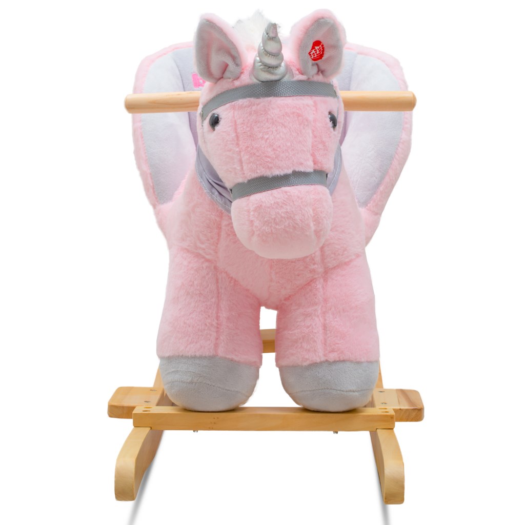 Ružový hojdací koník–jednorožec značky je výnimočná hračka, ktorá nadchne každé dieťa a stane sa jeho najlepším spoločníkom pri hre. Vyrobený je z mäkkého, na dotyk príjemného plyšu a osadený na stabilných drevených lyžinách, čo zaručuje bezpečnú a pohodlnú zábavu.