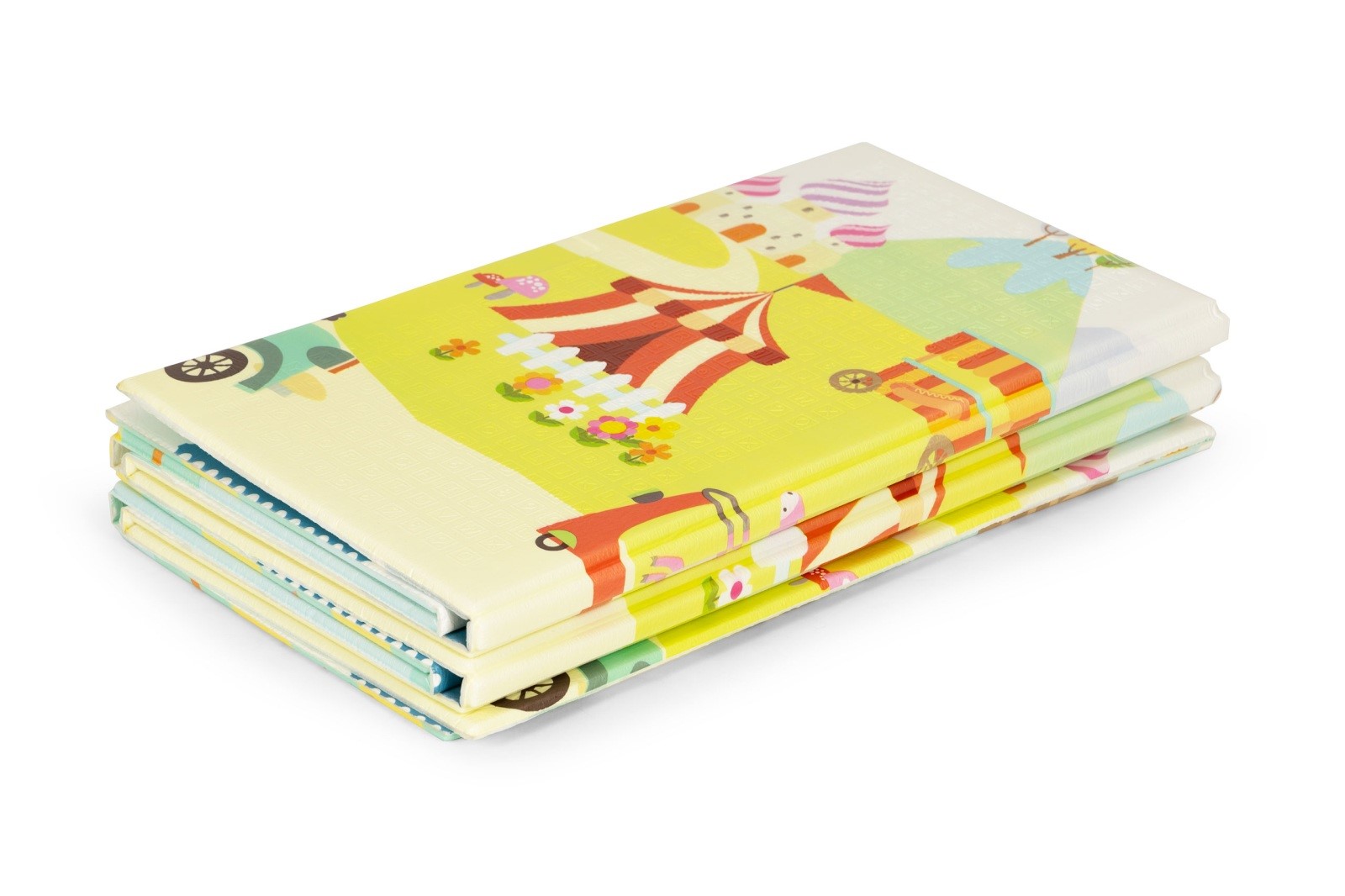 Podložka je veľmi praktická – dá sa rýchlo zložiť aj rozložiť, takže je ideálna na prenášanie aj skladovanie. Obe strany ponúkajú odlišné motívy: jedna strana zobrazuje cirkus so zvieratkami, druhá farebné obrázky s názvami zvierat a písmenkami.PRAKTICKÁ PRENÁŠACIA TAŠKA.