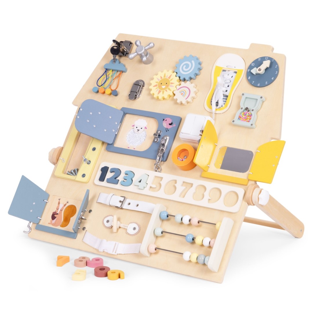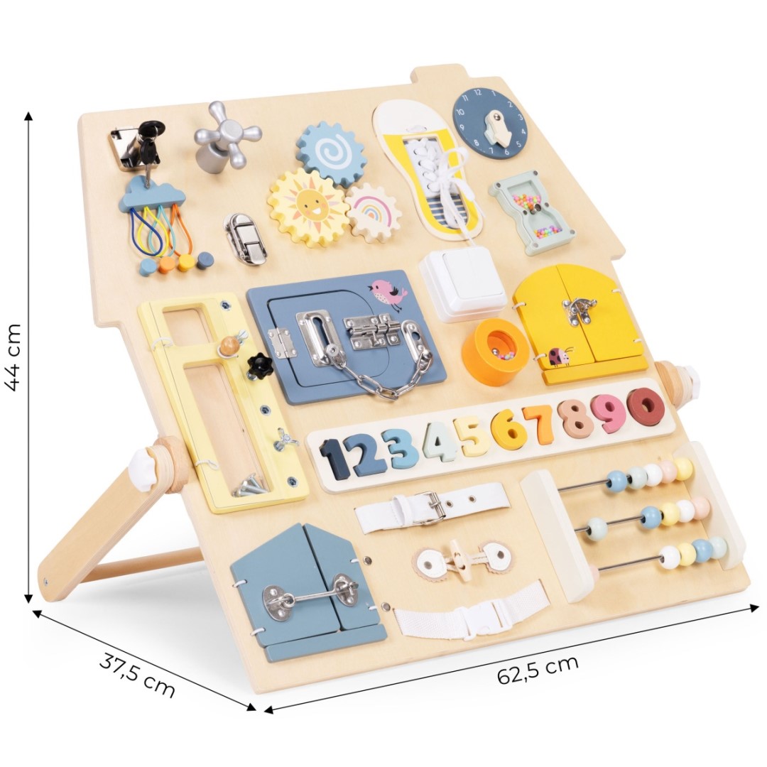 Akcia a reakcia – učenie hrou.Drevená tabuľa s aktivitami je skvelým pomocníkom pre prirodzený rozvoj dieťaťa. Vďaka prvkom ako zámky, ozubené kolieska, počítadlo, hodiny či šnúrky si deti trénujú zručnosť, učia sa logicky myslieť a rozvíjajú samostatnosť. Každý prvok motivuje k objavovaniu a experimentovaniu, takže deti spoznávajú svet dotykom, pohybom a pozorovaním. Stabilná konštrukcia umožňuje pohodlnú hru na podlahe a jemné farby sa hodia do každého detského izbičky.Topánka so šnúrkami. Pomáha rozvíjať koordináciu oko–ruka a vedie dieťa k samostatnosti.